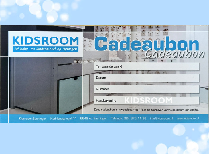 Kidsroom cadeaubonnen zijn verkrijgbaar in een bedrag nar keuze! Het bedrag hoeft niet in één keer besteed te worden. Als je een deel van het bedrag op de cadeaubon gebruikt, blijft de rest van het bedrag gewoon staan. Dat maakt een Kidsroom cadeaubon extra aantrekkelijk.