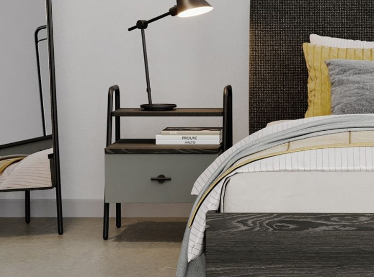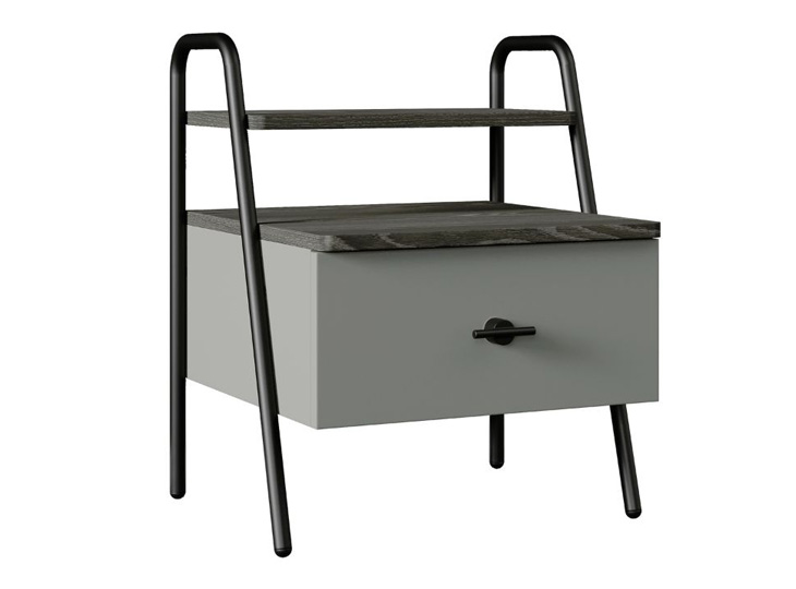 Met lade en open vak. Stoer design in zwart met eikenstructuur en grijze lade.