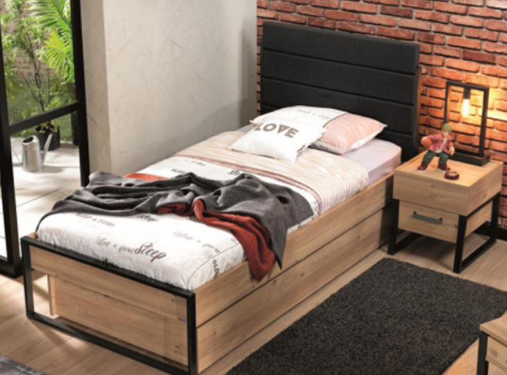 Irony is gemaakt van melamine houtvezelplaat in blank eikenkleur gecombineerd met antraciet gelakt metaal. Met een comfortabel bed gestoffeerd in antracietgrijze denim en een 3-Deurskast met genoeg opbergruimte!