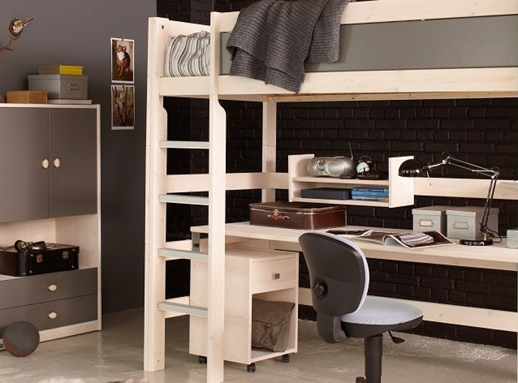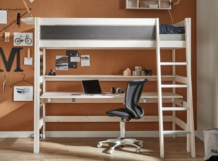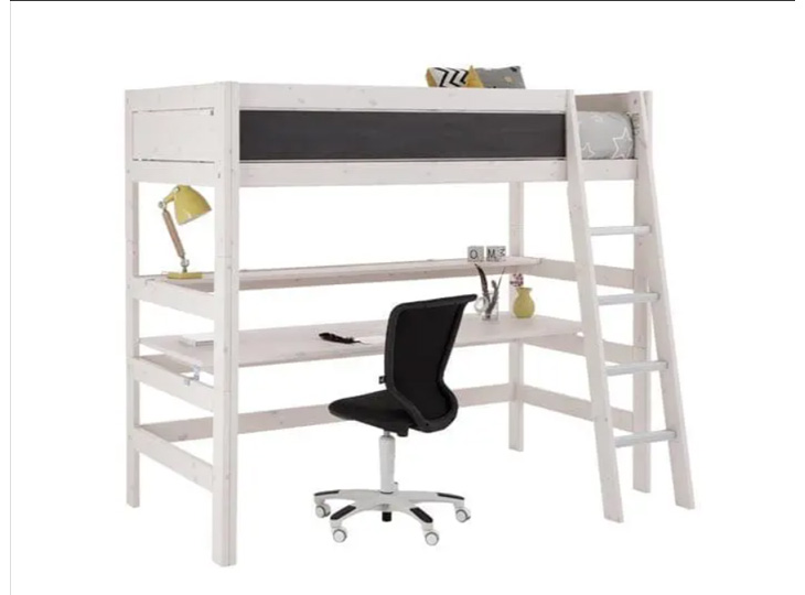 Gemaakt om te leren! Deze hoogslaper is er klaar voor. Met een groot werkblad over de volledige breedte onder het bed. Met de schuine ladder wordt het gemakkelijker om omhoog te klimmen. De trap kan zowel links als rechts worden gemonteerd. De boekenplank is in de de look van het bed, deze zorgt voor extra opbergruimte om de kamer netjes te houden. Gebruik het voor boeken, opbergdozen of plaats er een lamp op om een gezellige leesplek te creëren.Voor extra opbergruimte bij het bureau is er ook nog een handige ladekast bij te bestellen, deze staat op wielen en is dus makkelijk te verplaatsen door de kamer.