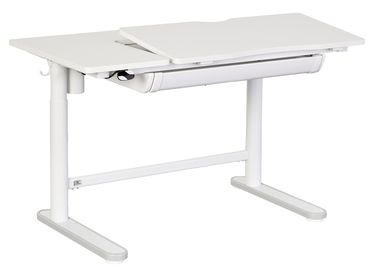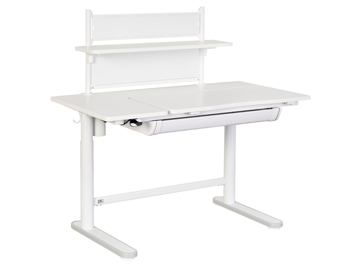 Dit slimme Ergo electrisch verstelbaar bureau is in hoogte verstelbaar (55–89 cm) via een knop onder het blad. Het rechterdeel kan tot 40° gekanteld worden – perfect om te tekenen of lezen. Gemaakt van melamine-gecoate spaanplaat (120x60 cm) en belastbaar tot 40 kg. Voorzien van een lade en haakje voor een schooltas.