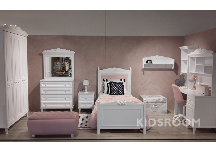 Deze kamer bestaat uit een romantisch bed met sierlijke elementen op het hoofd- en voetbord.