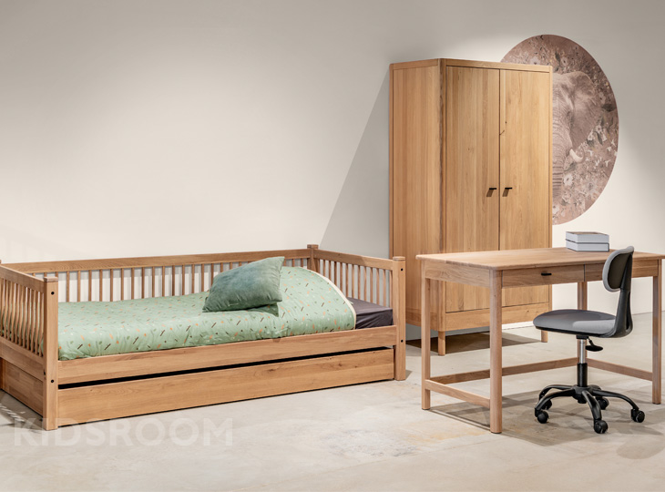 Ook het bijpassende bureau combineert stijl met functionaliteit. De strakke lijnen en minimalistische afwerking geven het een moderne uitstraling, terwijl de twee ruime laden voldoende ruimte bieden voor schoolspullen, schrijfwaren en andere benodigdheden. Dankzij de stevige bouw is het bureau perfect bestand tegen dagelijks gebruik.